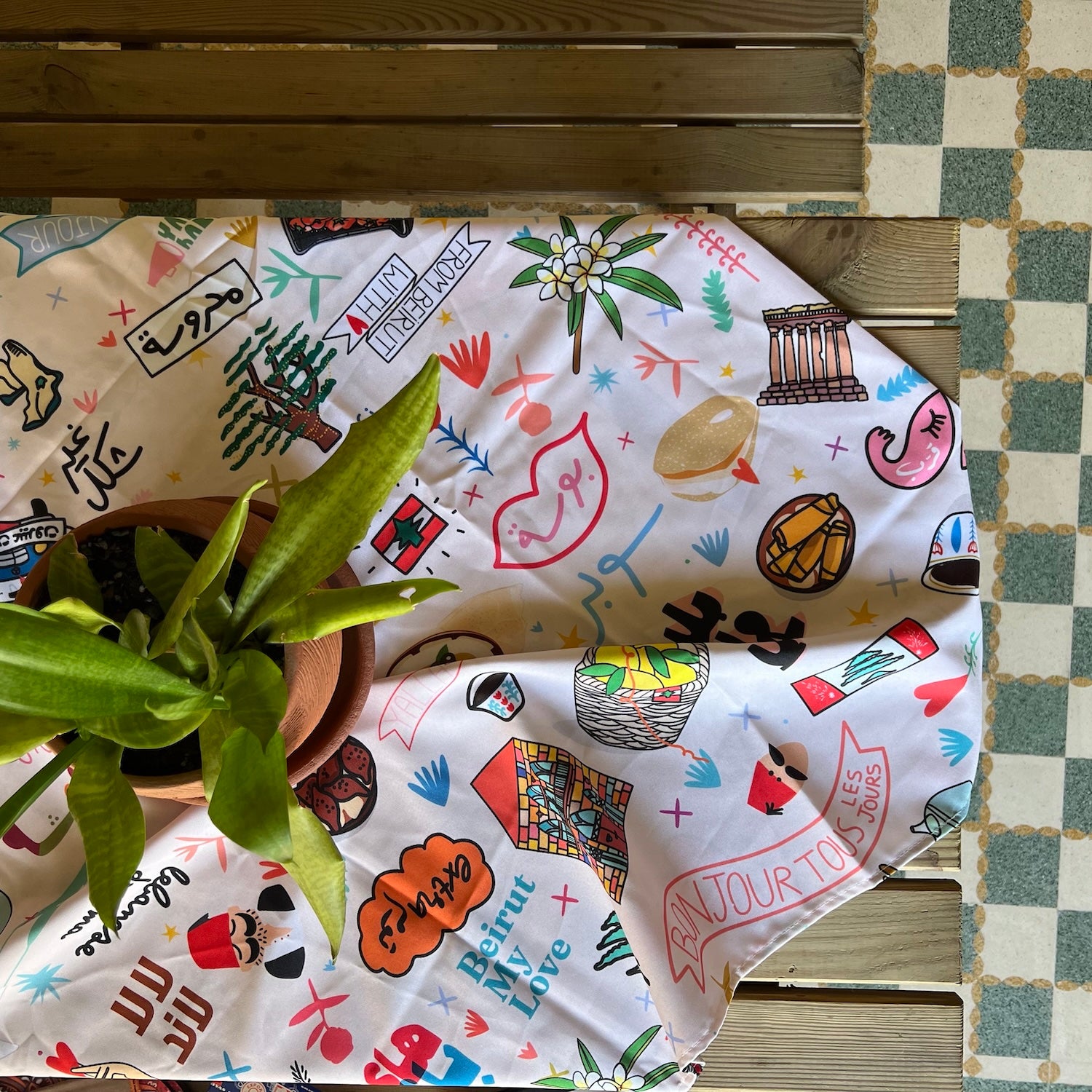 A new product to add a touch of Lebanese warmth straight to your family table. Full to the brim with all the small and lovely things that make up the fabric of our vibrant country, our "Leb Meli Melo" table cloth adds a colorful touch of home to your family gatherings, everyday lunches, and dinners with friends.